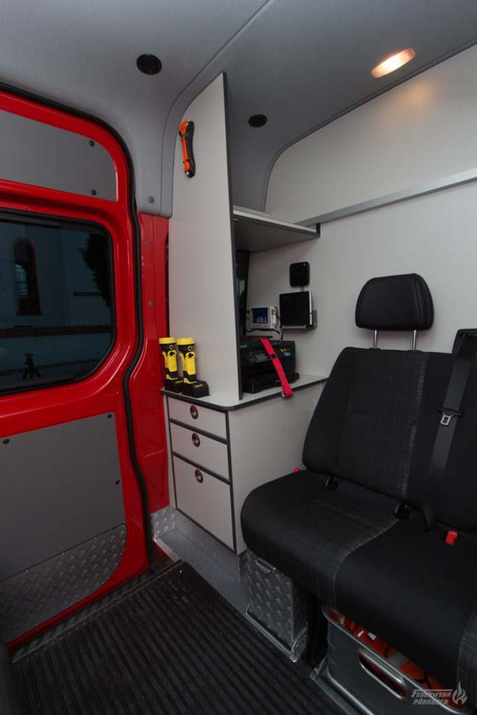 Funktisch, Leiter, Rettungsrucksack, Warnwesten, Anhaltestab, Funktisch klappbar, Drucker, Führungstafel, Einbauschrank, Router, Helmfach, Ahlageschublade unter Sitzbank.